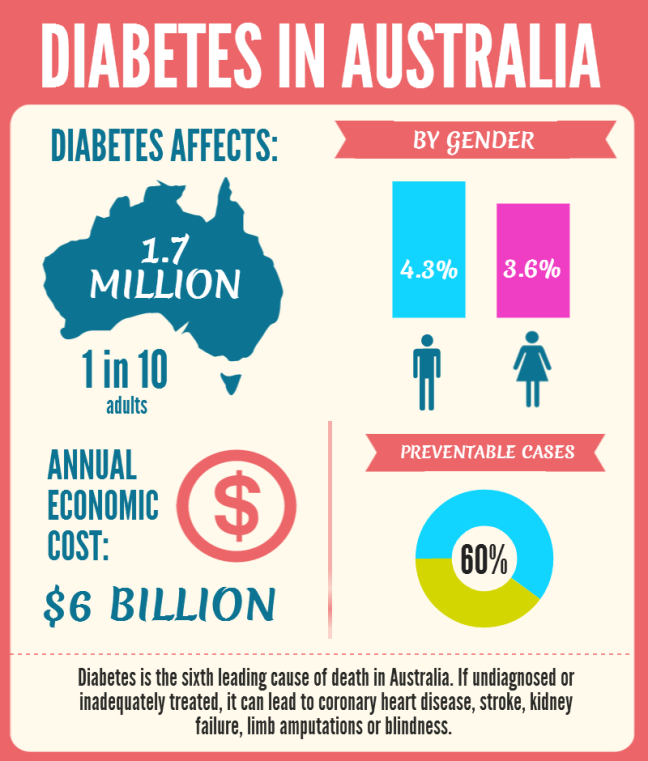 The prevalence of Type II Diabetes has been increasing dramatically over the past decade. Currently there are approximately 1.7 million Australians living with Diabetes, 280 more people are diagnosed every day. Type II Diabetes accounts for approximately 85% of all cases, with a total healthcare cost of $14.6 billion every year (Diabetes Australia, 2017).