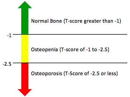 Bone density is determined using a Dual-energy X-ray Absorptiometry, more commonly known as a DEXA scan. Normal healthy bone has a T-score of -1 or more; Osteopenia -1 to -2.5 and Osteoporosis is diagnosed when you have a t-score of less than -2.5 (Exercise is Medicine). It is not uncommon that different bones in our body can have different T-scores, for example, our hip may be weaker and more fragile than other areas like our wrist or spine, therefore the hip is at a greater risk of fracture.
