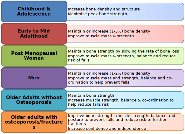Figure 1. Role of exercise in bone density & health at different stages of life (adapted from Osteoporosis Australia)